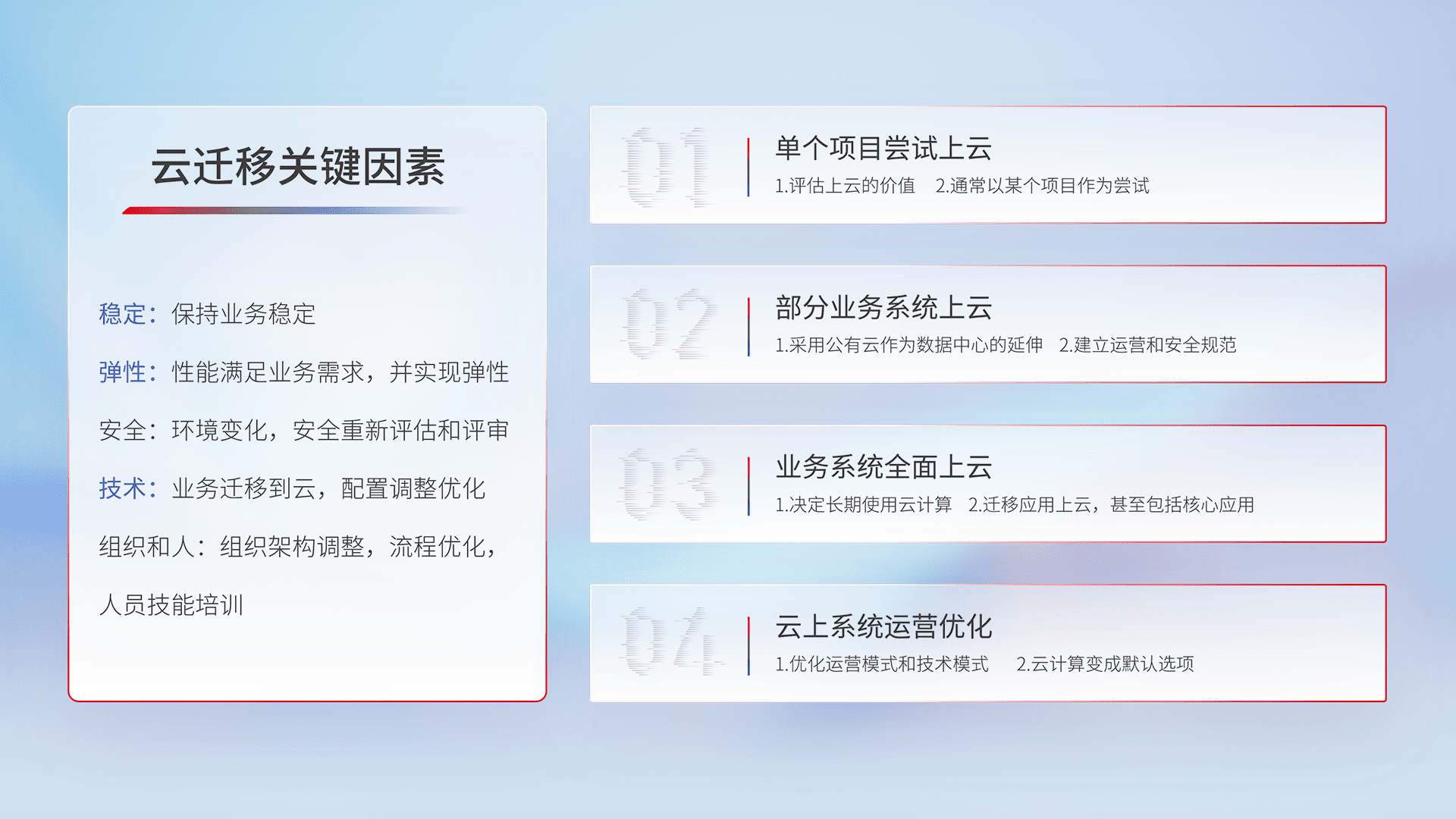 结合实际业务,,,从规划设计、、、云平台选型、、、、云原生改造、、、数据迁移、、、集成交付,,,迁移全过程为客户识别最佳上云路径,,,做好风险识别管理,,设计网络架构、、、、身份权限、、安全审计合规、、操作审计、、日志审计、、、、监控告警策略、、、、多站点容灾设计等,,对云上基础设施进行整体规划,,,提升IT治理水平,,以满足弹性、、、、高可用、、、、高性能的需求。。。。