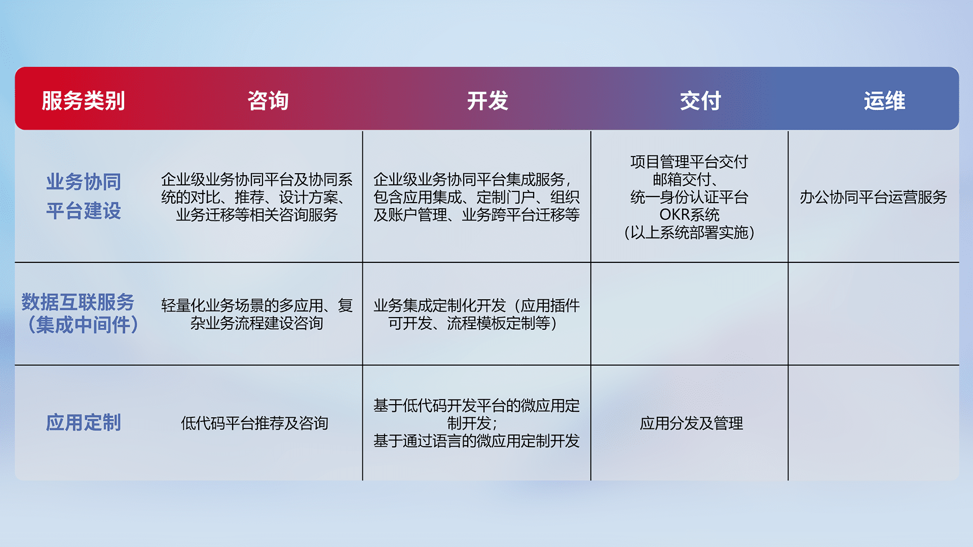 针对钉钉、、、、企微、、IDaas等平台级产品提供产品的规划、、、、方案、、、、交付、、、定制化开发等服务,,,实现如统一协同办公、、、智能客户服务、、混合会议管理、、智能数据查询、、、、等业务场景,,,,实现数字化转型。。
